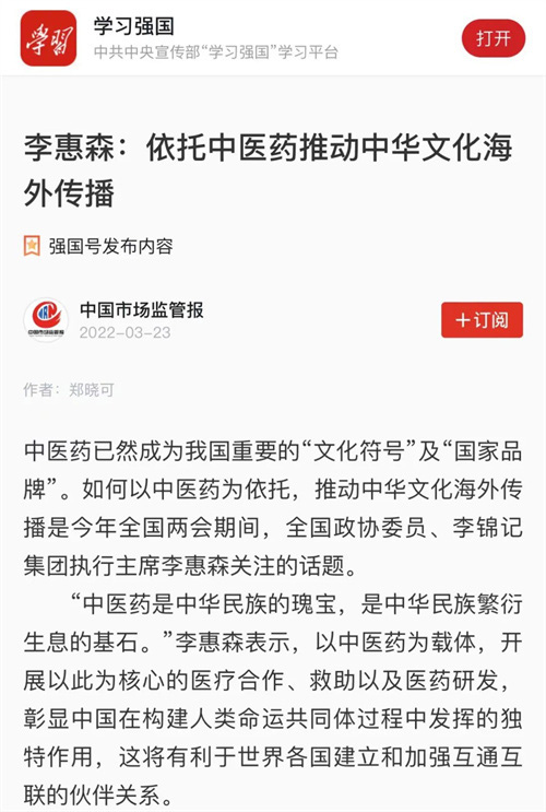3月23日,权威媒体“学习强国”号转载了“中国市场监管报”的文章:《李惠森:依托中医药推动中华文化海外传播》。
