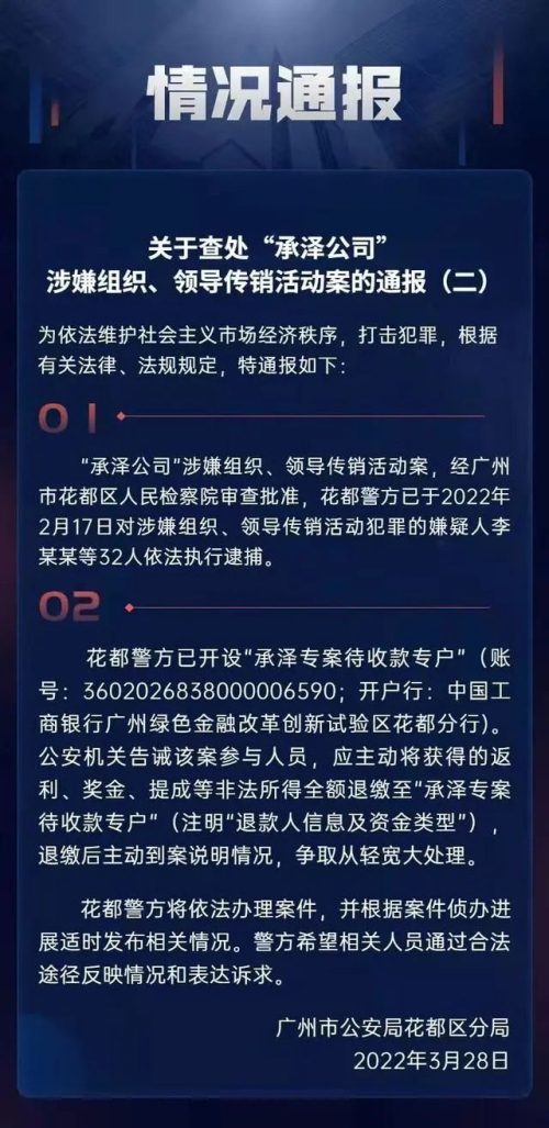 3月28日,南都记者注意到,广州市公安局花都区分局进一步通报“关于查处‘承泽公司’涉嫌组织、领导传销活动案”,告诫该案参与人员,应主动将获得的返利、奖金、提成等非法所得全额退缴至案件相关账户。