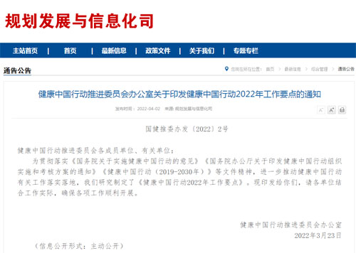 4月2日,健康中国行动推进委员会办公室印发健康中国行动2022年工作要点。