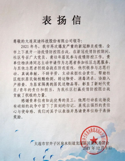 此次大连“3·14”疫情发生后,双迪公司员工杨洪涛主动申请作为志愿者参加社区志愿服务。