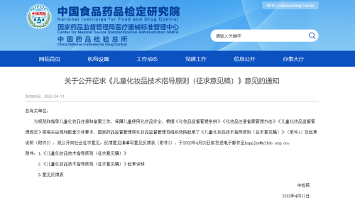 4月11日,中国食品药品检定研究院发布关于公开征求《儿童化妆品技术指导原则(征求意见稿)》(以下简称《指导原则》)意见的通知。