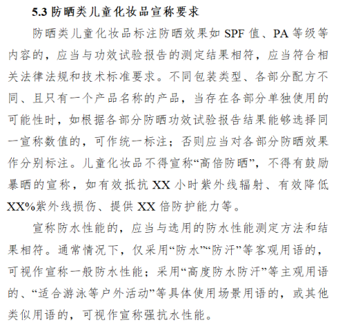 对于宣称防水性能的儿童化妆品,根据其所宣称抗水程度或时间按规定的方法检测防水性能。产品防水性能测定结果显示洗浴后SPF值减少超过50%的,不得宣称防水效果。