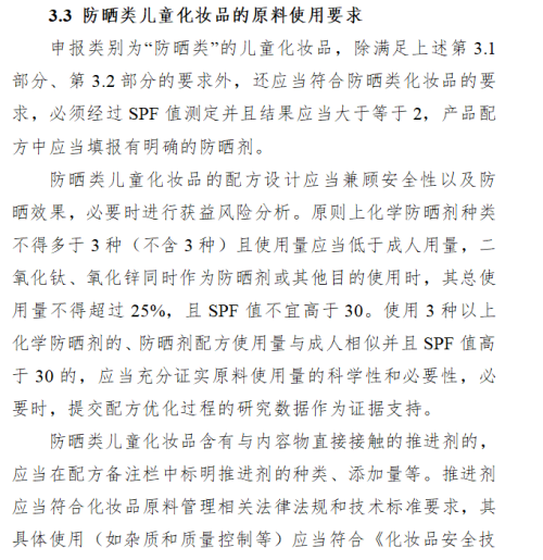 对于防晒类儿童化妆品的配方设计,《指导原则》要求原则上化学防晒剂种类不得多于3种(不含3种)且使用量应当低于成人用量,二氧化钛、氧化锌同时作为防晒剂或其他目的使用时,其总使用量不得超过25%,且SPF值不宜高于30。使用3种以上化学防晒剂的、防晒剂配方使用量与成人相似并且SPF值高于30的,应当充分证实原料使用量的科学性和必要性,必要时,提交配方优化过程的研究数据作为证据支持。