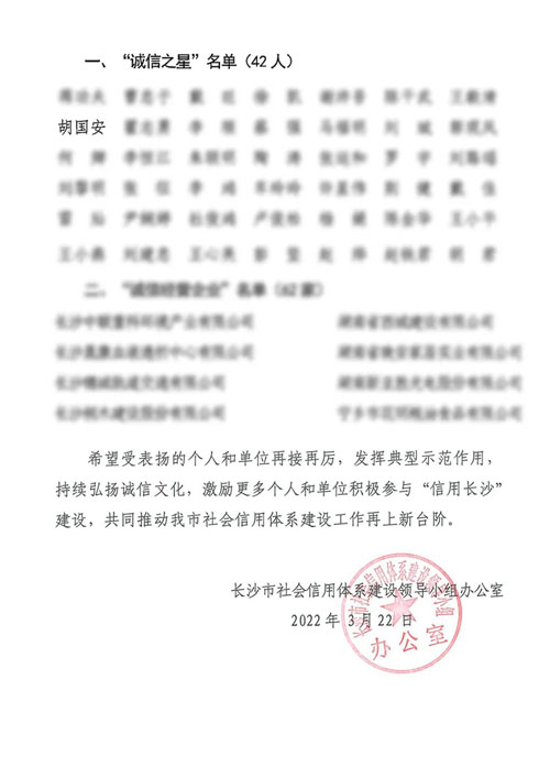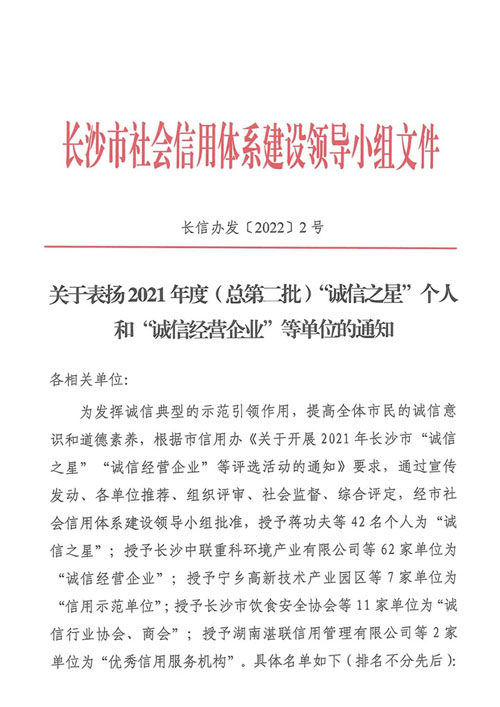 近日,长沙市社会信用体系建设领导小组办公室发布《关于表扬2021年度(总第二批)“诚信之星”个人和“诚信经营企业”等单位的通知》,绿之韵集团董事长胡国安凭借引领企业在诚信体系建设领域所取得的优异成果受到政府表彰,荣获长沙市“诚信之星”荣誉表彰。