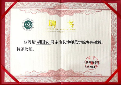 长沙师范学院党委委员、副校长黄快林向胡国安董事长颁发“长沙师范学院客座教授”聘书