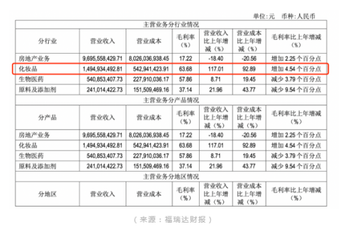 财报显示,业绩下滑主要为地产业务受市场下行影响。不过,除地产业务外,化妆品、生物医药、原料及添加剂业务板块均实现同比增长。其中,化妆品业务表现格外抢眼。报告期内,化妆品板块营业收入实现14.95亿元,同比增长117.01%;毛利率为63.68%,上升4.54个百分点。