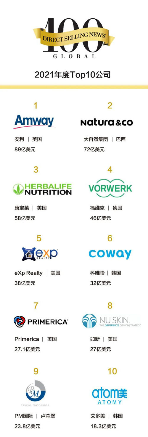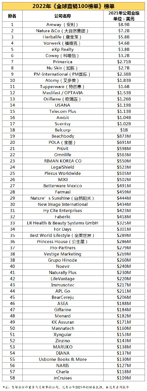 美国直销新闻网(Direct Selling News)在4月20日发布2022年《全球直销100榜》榜单,表彰年收入超过1亿美元的公司。该榜单为行业对于全球经济和社会领域的影响提供了独特视角,也为业内人员、研究人员、投资者和创业人员提供了相互学习的机会。