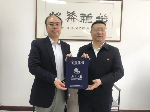 山西省青基会张华理事长向张宏斌总经理颁发捐赠证书