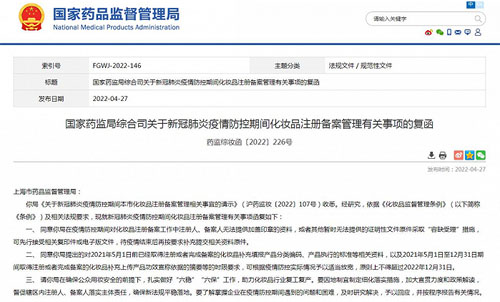 国家药监局在“关于新冠肺炎疫情防控期间化妆品注册备案管理有关事项的复函(下称复函一)”中表示,“同意上海药监局提出的对2021年5月1日前已经取得注册或者完成备案的化妆品补充填报产品分类编码、产品执行的标准等相关资料,以及2021年5月1日至12月31日期间取得注册或者完成备案的化妆品补充上传产品功效宣称依据的摘要等的时限要求,可根据疫情防控实际情况予以适当放宽,原则上不得超过2022年12月31日”。
