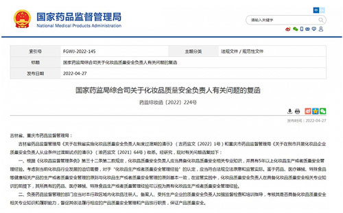 国家药监局在回复吉林省药监局和重庆市药监局“关于化妆品质量安全负责人有关问题的复函(下称复函二)”中明确表示,对于“化妆品生产或者质量安全管理经验”的认定,应当符合法规立法原意和监管实际。“鉴于药品、医疗器械、特殊食品等健康相关产品的生产或者质量安全管理的原则与化妆品生产或者质量安全管理的原则基本一致。因此。在监管实践中,化妆品质量安全负责人在具备化妆品质量安全相关专业知识的前提下,其所具有的药品、医疗器械、特殊食品生产或者质量管理经验可以视为具有化妆品生产或者质量安全管理经验。”