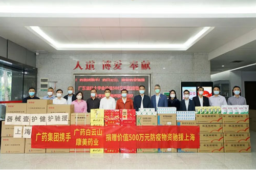 4月5日,广药集团携广药白云山、康美药业火速筹集500万防疫药品物资通过广东省红十字会驰援上海,包括防护服、口罩等防疫急需物资,白云山板蓝根颗粒、白云山小柴胡颗粒、花城抗病毒口服液等健康饮品。