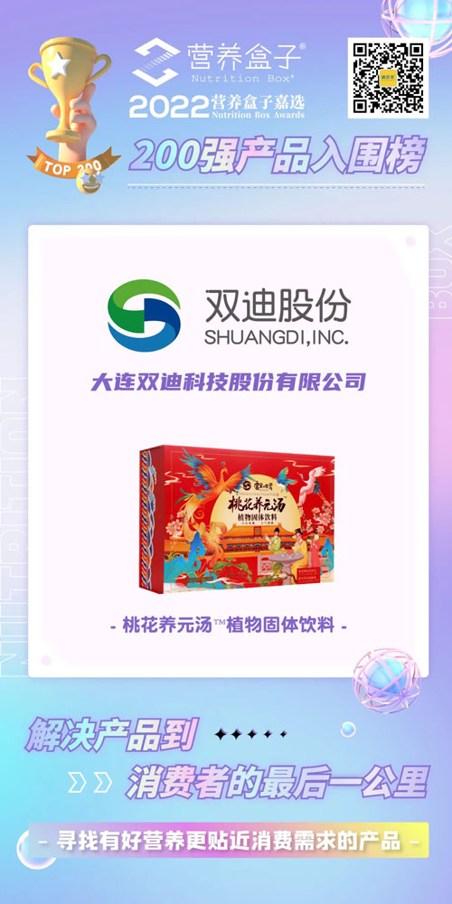 5月,由新营养New Nutrition与营养盒子Nutrition Box联合发起的“2022营养盒子嘉选新锐榜”正式公布,双迪携旗下桃花养元汤™植物固体饮料、桃花固元汤™植物固体饮料从诸多参选品牌及产品中脱颖而出,成功入围!