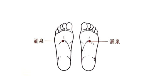 涌泉穴是足少阴肾经的常用腧穴之一,位于足底部,蜷足时足前部凹陷处,约当足底第2、3跖趾缝纹头端与足跟连线的前1/3与后2/3交点上。功能疏通肾精,散热生气,排除浊气,现代常用于治疗休克、高血压、失眠、癔病、癫痫、小儿惊风、神经性头痛、遗尿、尿潴留等,为急救穴之一。涌泉药物敷贴是临床常用的治疗方法之一,经常按摩对平稳血压有辅助作用。