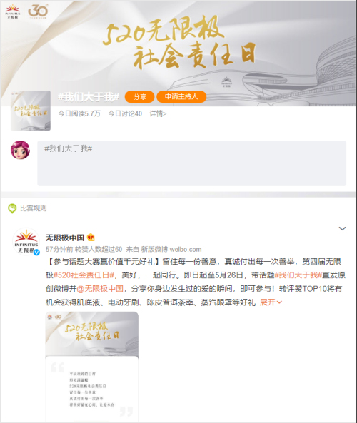 在520到来前夕,无限极以#我们大于我#为话题发起了微博打卡活动,倡导大家分享身边发生过的爱的瞬间,希望通过对“爱”的表达,引发对“我们大于我”的思考。截止5月20日,活动话题阅读量已经达到43.6万人。