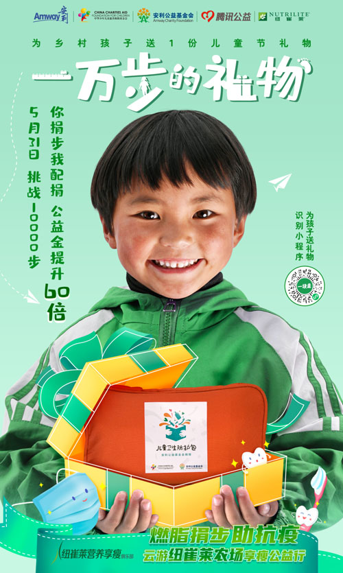 5月31日,六一国际儿童节到来之际,安利公益基金会联合中华少年儿童慈善救助基金会、通过腾讯公益平台,发起“一万步的礼物”公益捐步活动,将从4月11日开始的1万步常规配捐1元的公益金,仅在5.31当日膨胀60倍,“你走1万步,我捐60元”,为乡村儿童采购一份“卫生防护包”。公众可通过微信“一块走”小程序即时参与,健康自己帮助他人,为乡村孩子送去一份儿童节礼物。
