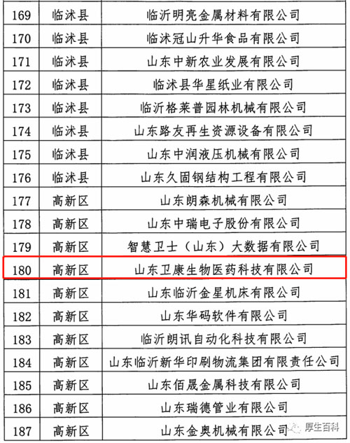 近日,临沂市工业和信息化局公布2022年度市级“专精特新”企业名单,山东卫康生物医药科技有限公司位列其中!