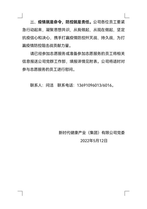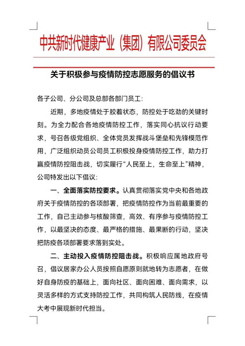公司党委响应新时代集团党委号召,向公司全体员工发出《关于积极参与疫情防控志愿服务的倡议书》,号召员工在居家办公期间,按照自愿原则就地转为志愿者,配合社区开展核酸检测信息录入、扫码登记、秩序维护等疫情防控工作,随时扮演社区防疫宣讲员、劝导员、服务员、信息员等角色,以灵活多样的方式大力支持各地防控工作,充分彰显新时代人的责任与担当。