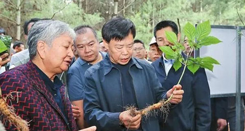 朱有勇院士(前排左二)、朱兆云院士(前排左一)一行参观康美药业林下有机西洋参种植基地