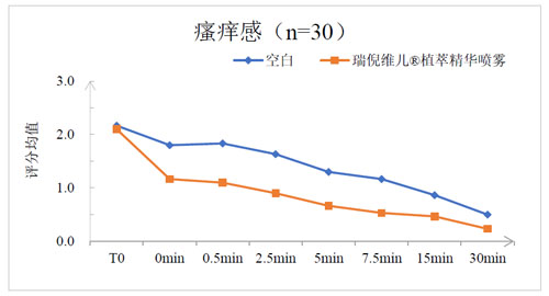 瘙痒感评分结果显示,在使用测试样品后30 min内,样品测试区域的瘙痒感评分均值均低于空白,样品测试区域的瘙痒感评分均值与空白组对比差异均有统计学意义(P<0.05)。