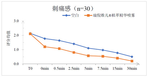结论:在30 min的测试周期内,瑞倪维儿植萃精华喷雾具有对乳酸引起的皮肤刺激的舒缓功效。