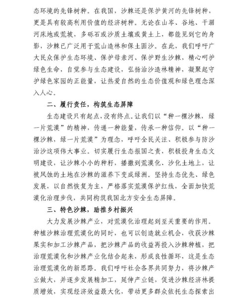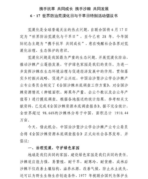 今天也是第28个世界防治荒漠化与干旱日,中国治沙暨沙业学会沙棘产业专业委员会将《全国沙棘资源本底调查报告》正式向社会各界进行发布,同时中国治沙暨沙业学会沙棘产业专业委员会向社会各界发出倡议,呼吁全民关注、积极参与防沙治沙,参与到生态文明建设、参与到荒漠化防治这项伟大事业中来。让更多的人意识到土地沙化、荒漠化的严重性。让沙棘小小的种籽,播撒到沙化土地的每一寸,让被风蚀的土地在沙棘的滋养下变成绿洲。