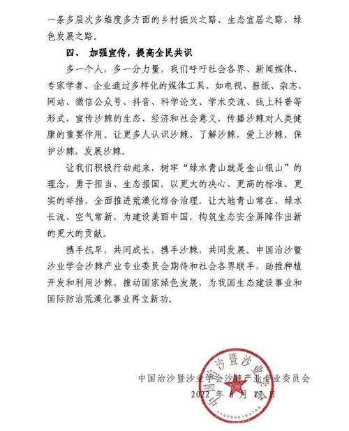 中国治沙暨沙业学会沙棘产业专业委员会秘书长王尚义代表沙棘专委会正式向社会各界发出倡议