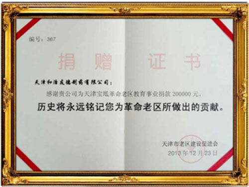 2013年和治友德捐款200000元,在宝坻区革命老区建立了“和治友德希望小学”,改善当地办学条件。