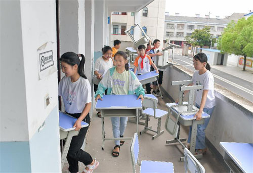 “我们有新书桌啦,快点搬上去吧!”一帮高年级的孩子们欢呼雀跃地奔向刚运到的桌椅,你拎两把椅子,我扛一张桌子,劲头十足地搬到跃莱爱心书屋里去。“轻点,别慌,一张张搬就够了!”朱湖中心小学校长肖立楚和老师们叮嘱沉浸在喜悦中的孩子们。