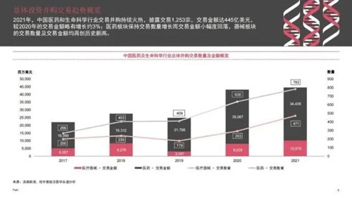 普华永道在4月发布的《2021年企业并购市场回顾-中国医药和生命科学行业》报告指出,2021年,中国医药和生命科学行业交易并购持续火热,披露交易1,253宗,交易金额达445亿美元。此外,2021年共有33家医疗器械企业上市,覆盖体外诊断、骨科植入耗材、心血管植入器械等细分领域。2021年医药行业IPO数量也创新高,共57家。