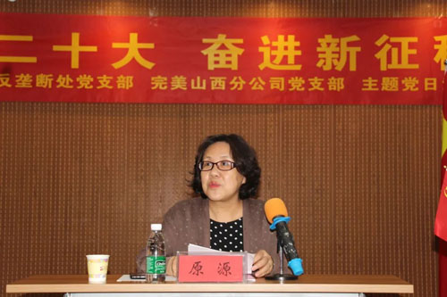 党支部书记原源在作《省市场监督管理局反垄断和反不正当竞争处认真开展基层支部党建品牌创建工作》时,从反垄断和反不正当竞争处党支部三年来在思想建设、组织建设、作风建设和制度建设等方面,介绍了如何将双反处党支部打造成为山西省市场监督管理局众多基层党支部中的品牌党支部的先进经验,这些教科书级的经验和做法对年轻的完美山西分公司党支部的建设无疑是一种宝贵的财富。