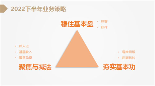 薛守春先生为我们分享了公司下半年,在支持市场发展方面的重要行动和举措。他特别强调,公司“五五”计划变革的方向不会改变,打造三大差异化竞争力、创造“好轻优”新价值的方向不会改变。在长期方向不变的前提下,公司下半年的业务策略方向:稳住基本盘、聚焦与减法、夯实基本功。