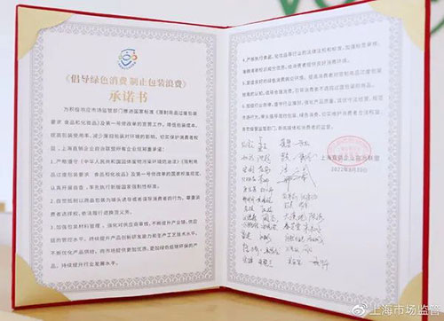承诺内容包括:严格遵守《中华人民共和国固体废物污染环境防治法》《限制商品过度包装要求 食品和化妆品》及第一号修改单的国家标准的规定,认真开展自查,率先执行新版国家强制性标准。自觉抵制以商品包装为噱头诱导或者误导消费者的行为,尊重消费者选择权,依法履行退换货义务。加强包装材料管理,强化对供应商审核,不断提升产业链、供应链的管控水平。持续提升产品创新研发能力和生产工艺技术水平,不断优化产品供给,向市场提供更加优质、更加绿色低碳环保的产品,持续提升行业发展水平。严格执行食品、化妆品等行业的法律法规和标准,加强标签审核,准确清晰标识成分信息,给消费者提供良好消费环境。营造良好的绿色消费舆论环境,提高消费者对限制商品过度包装标准的认知,倡导合理消费,引导消费者不选购过度包装的商品。加强行业自律,遵守行业准则,强化产品质量,诚信守法经营,规范市场行为。带头倡导简约包装、绿色消费,切实维护消费者合法权益,自觉接受监管部门、新闻媒体和消费者的监督。