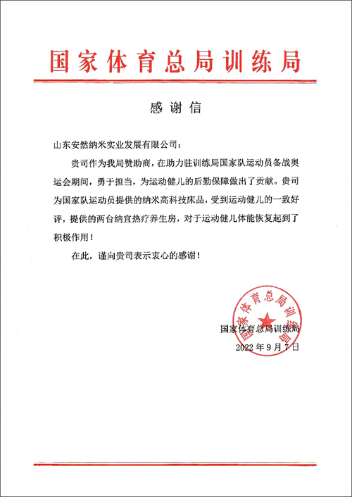 信中表示,安然集团勇于担当,为运动健儿的后勤保障作出了积极贡献!安然纳米高科技床品受到运动健儿的一致好评,纳宜热疗养生房也对运动员的体能恢复起到了积极作用。