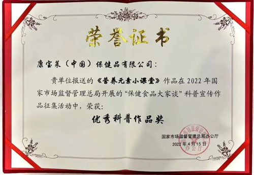 此外,康宝莱依托自身积累的全球经验和专业知识,围绕科学膳食、营养素补充剂使用、免疫力提升、疫情期间的居家运动和科学减重等话题积极开展科普活动,邀请权威专家进行直播,拍摄制作营养知识科普视频等。近日,康宝莱制作的科普短视频《营养元素小课堂》作品还获得了市场监督管理总局开展的“保健食品大家谈”科普宣传作品征集活动“优秀科普作品奖”,以创新趣味的形式深入浅出的向公众介绍营养科普知识。希望通过这些方式助力提高公众的营养素养和健康意识,倡导健康的生活方式。