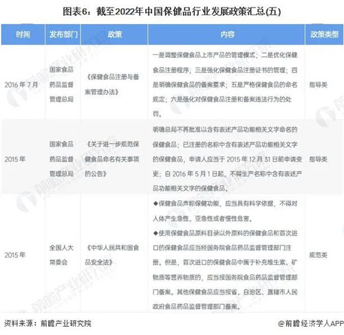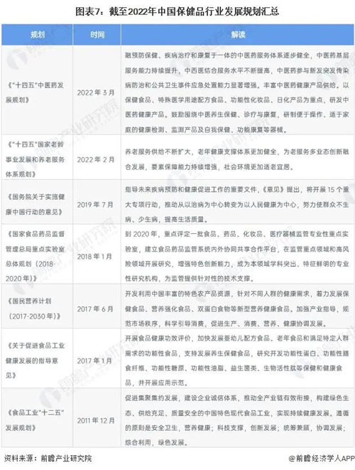 2011年12月,国家发改委、工信部共同发布了《食品工业"十二五"发展规划》,首次将"营养与保健食品制造业"列入国家发展规划。2017年6月,国务院印发《国民营养计划(2017-2030年)》,提出要着力发展保健食品、营养强化食品、双蛋白食物等新型营养健康食品。2022年发布了《"十四五"中医药发展规划》,提出要大力发展中药保健品。