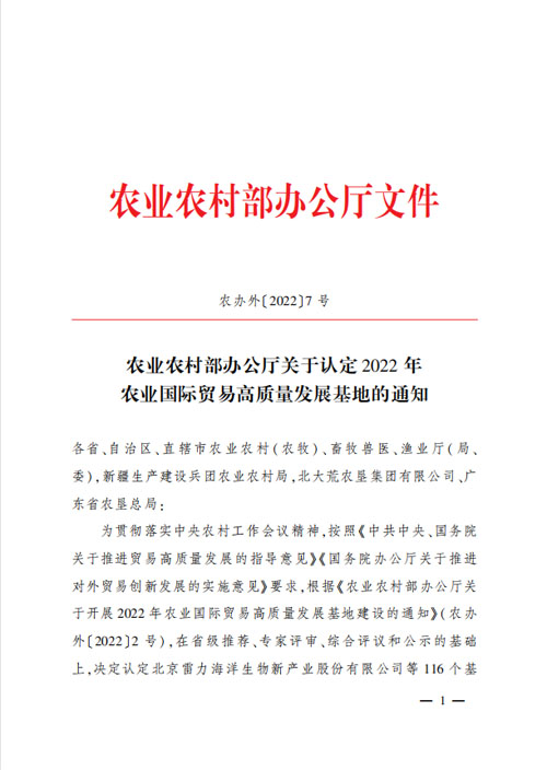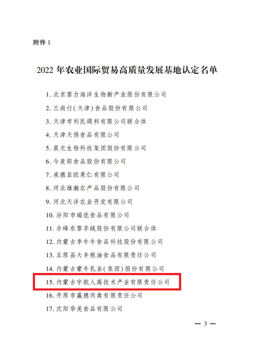 2022年,农业农村部正式发布了《关于认定2022年农业国际贸易高质量发展基地的通知》,宇航人作为沙棘行业的领军企业,被国家农业农村部认定为2022年度农业国际贸易高质量发展基地!