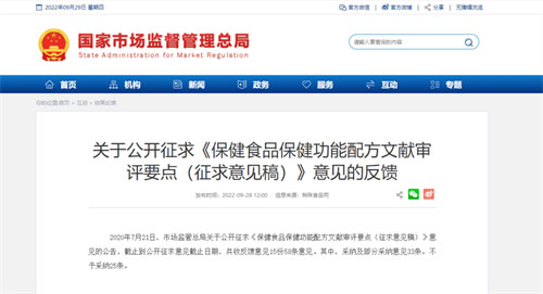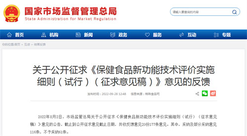 2022年8月2日,市场监管总局关于公开征求《保健食品新功能技术评价实施细则(试行)(征求意见稿)》意见的公告,截止到公开征求意见截止日期,共收反馈意见20份177条意见。其中,采纳及部分采纳意见116条,不予采纳61条。