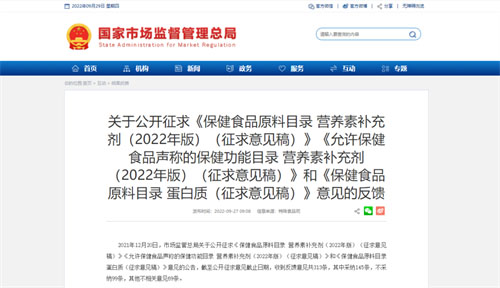 2021年12月20日,市场监管总局关于公开征求《保健食品原料目录营养素补充剂(2022年版)(征求意见稿)》《允许保健食品声称的保健功能目录营养素补充剂(2022年版)(征求意见稿)》和《保健食品原料目录蛋白质(征求意见稿)》意见的公告,截至公开征求意见截止日期,收到反馈意见共313条,其中采纳145条,不采纳99条,其他不相关意见69条。