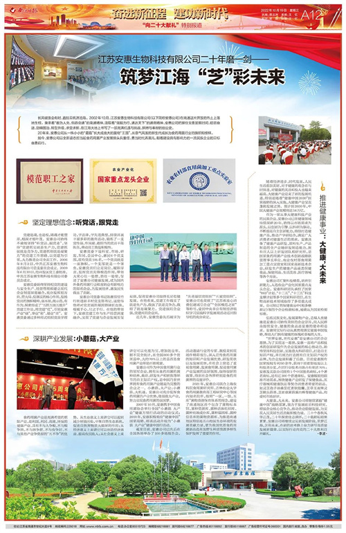 2022年10月19日,《南通日报》上刊登了《筑梦江海“芝”彩未来——江苏安惠生物科技有限公司二十年磨一剑》的报道,全文内容如下: