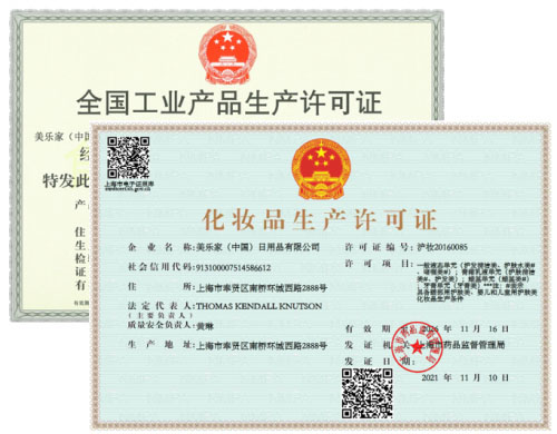 一直以来,美乐家(中国)都严格坚守质量管控标准,在产品生产运输过程中层层把关,不仅仅是达到,更要超越国家对于生产质量的要求。2021年底,美乐家上海工厂获得了上海市市场监督管理局签发的化妆品生产许可证以及食品用洗涤剂生产许可证,这也说明了美乐家上海新工厂的生产质量管理体系达到了国家线的要求,也获得了质检专家们的认可。