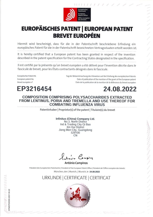 近期,由无限极(中国)有限公司申请的发明专利——Composition comprising polysaccharides extracted from lentinus, poria and tremella and use thereof for combating influenza virus(中文译意:从香菇、茯苓和银耳中提取的复合多糖组合物对抗流感病毒的作用),正式获得由欧洲专利局(EPO)颁发的专利证书(专利号:EP3216454B1)