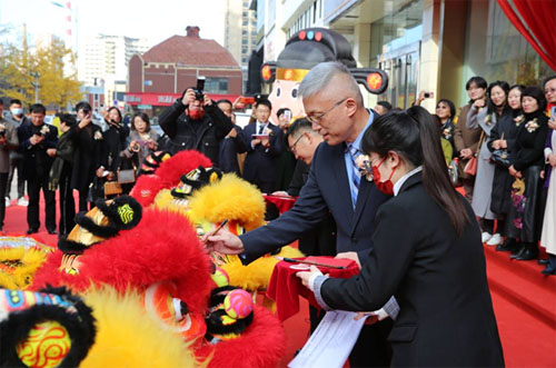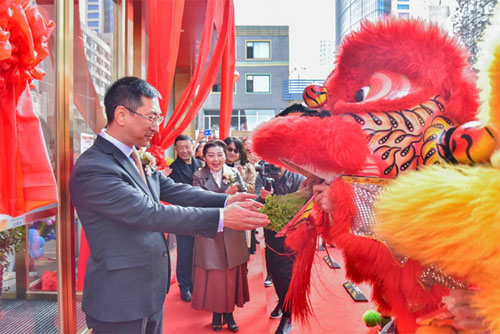 在醒狮表演环节中,黄宇明副总裁、钟炜总经理共同为开业雄狮点睛,恭贺全新的沈阳体验中心开业大吉。瑞狮采青,将 "青"送给辽宁分公司李屹总监,寓意瑞气临门,生财有道,步步高升。