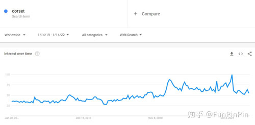 在谷歌趋势中,"紧身胸衣 "的全球搜索量逐年增加,并在2021年底达到高峰。时尚专家预测,作为2022年的主打时尚趋势之一,紧身胸衣将变得更加流行。