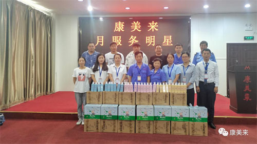 为鼓励员工干劲,进一步营造上下竞先争优的氛围。近日,康美来公司党支部副书记尹维龙代表公司向评选出的生产一线和后勤先进员工发放月服务明星福利,并与大家合影留念。