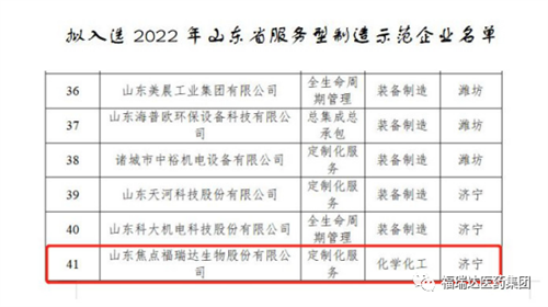 近日,在山东省工业和信息化厅公布了2022年山东省服务型制造示范企业名单。经过申报、推荐、专家评审等环节,福瑞达医药集团旗下山东焦点福瑞达生物股份有限公司成功入选。