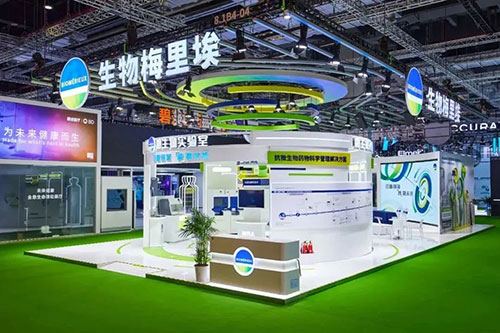 此次进博会,生物梅里埃以【诊断创新,“智”敬未来】为主题,充分将其在抗微生物药物的科学管理与精准使用的研究成果展示给大家。针对这一命题,德致展览围绕【微生物实验室】展开整体设计,环状的实验室与顶部螺旋上升的圆形结构相呼应,同时搭配品牌标志色的流水灯带,让游客在参观其全流程解决方案的同时,感受到这次品牌参展所传递的“让生命永续,人类生生不息”这一愿景。