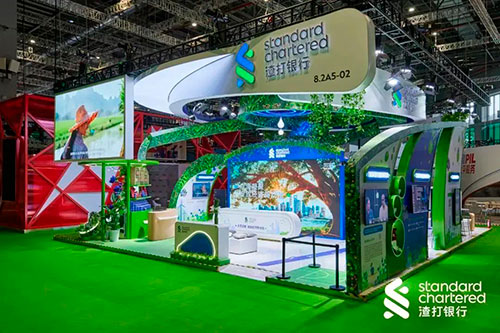 本次渣打银行进博会的展台主题为“点滴凝聚,绽放经济新动能”。从渣打银行品牌元素出发,以“润泽、生长、绽放”作为展台设计主线,以“城市森林”作为视觉核心,以代表蓬勃生机的绿色为主基调,以渣打品牌色中的蓝色为辅,通过绿植、机械花打造森林感,搭配展板金融业务线内容的打造城市感,营造多维立体的展台空间,多重角度展现绿色生态的人与自然之美,人与社会发展和谐共生。(展台服务商:德致(上海)展览服务有限公司)