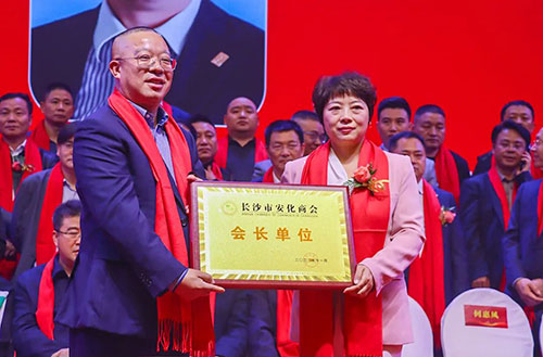 中共长沙市统战部副部长、市工商联党组书记何惠风为胡国安会长授牌