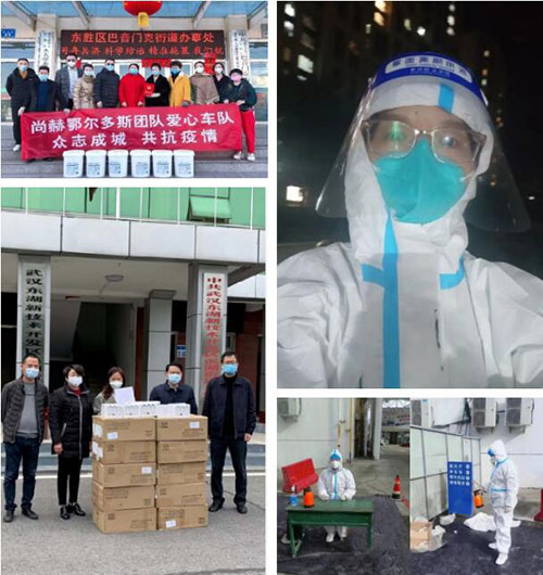 ▲以上图片来自:尚赫鄂尔多斯团队向当地一线值班人员捐赠物资(左一)、尚赫爱心志愿者王笑一在抗疫一线变身“大白”(右一)、尚赫侯玉霞团队向武汉市东湖新技术开发区滨湖街疫情指挥部捐赠护手霜(左二)、尚赫新疆团队在抗疫一线纷纷变身“大白”(右二)