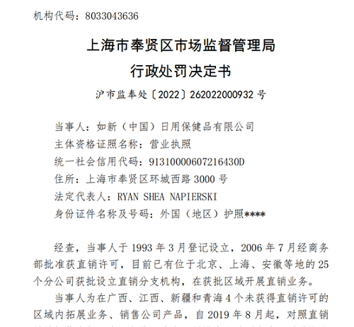 该处罚书显示,案发后,如新(中国)已将2022年的相关直销员培训内容在中文官网予以公示。上述直销员培训为当事人自行开展,不收取费用,无违法所得。